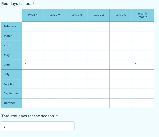 For example, 2 days fished in the first week in June with a total for the month and season being 2.