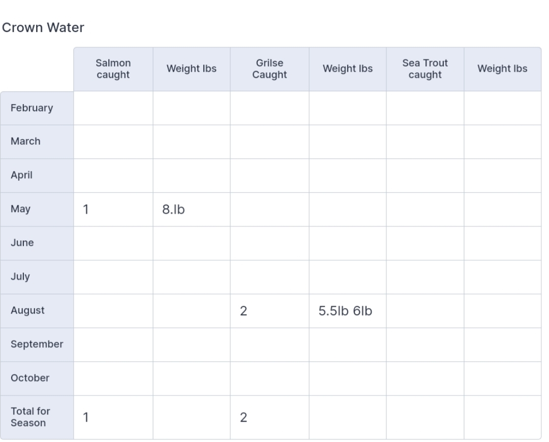 1 Salmon weighing 8 lb caught on Crown water in May and 2 Grilse weighing 5.5 lb and 6 lb caught in August.Totals for the season being 1 and 2 respectively.