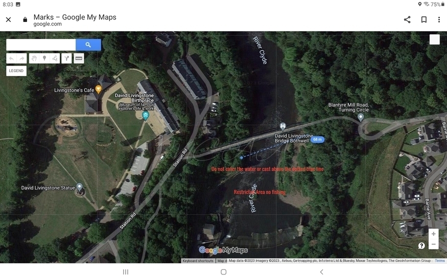 Fishing is strictly prohibited in the area above the upstream side of the RED markers on the plinth of the David Livingston Bridge Bothwell side and the wall below the bridge footing on the Blantyre side and also prohibited 50 yards above the weir.